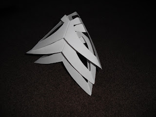 After looking through my experiments I decided the fastening I liked best was the three of the three shield shapes fastened together by the side. I decided to keep it just down to the three fastened together and made four of these shapes, I planned to suspend them with thin string from each other, but with them facing alternate ways, so the top one would face up, the second one down etc...